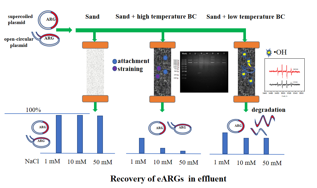 研究发现生物质炭能显著抑制胞外抗生素抗性基因的水平基因转移能力。低温(300 °C)生物质炭体系诱导质粒缩合反应,降低感受态细菌的细胞膜通透性,从而阻止感受态细菌对质粒的吸收和转化。高温(700 °C)生物质炭颗粒对质粒具有很强的不可逆吸附作用,被生物质炭吸附的质粒几乎不能被感受态细菌所利用而发生水平基因转移。同时,研究进一步发现生物质炭能有效降低胞外抗生素抗性基因在多孔介质中的迁移能力。在迁移过程中,高温(700 °C)生物质炭主要通过增加吸附容量、粘附作用(attachment)和筛滤作用(straining)等机制抑制了胞外抗生素抗性基因的迁移能力。低温(300 °C)生物质炭主要通过诱导羟基自由基的产生,使得开环质粒受到了碎片化损伤而失去活性,从而抑制了胞外抗生素抗性基因的迁移。上述研究成果将为缓解水土介质中抗生素抗性基因的传播扩散提供新的解决思路。(漫画人