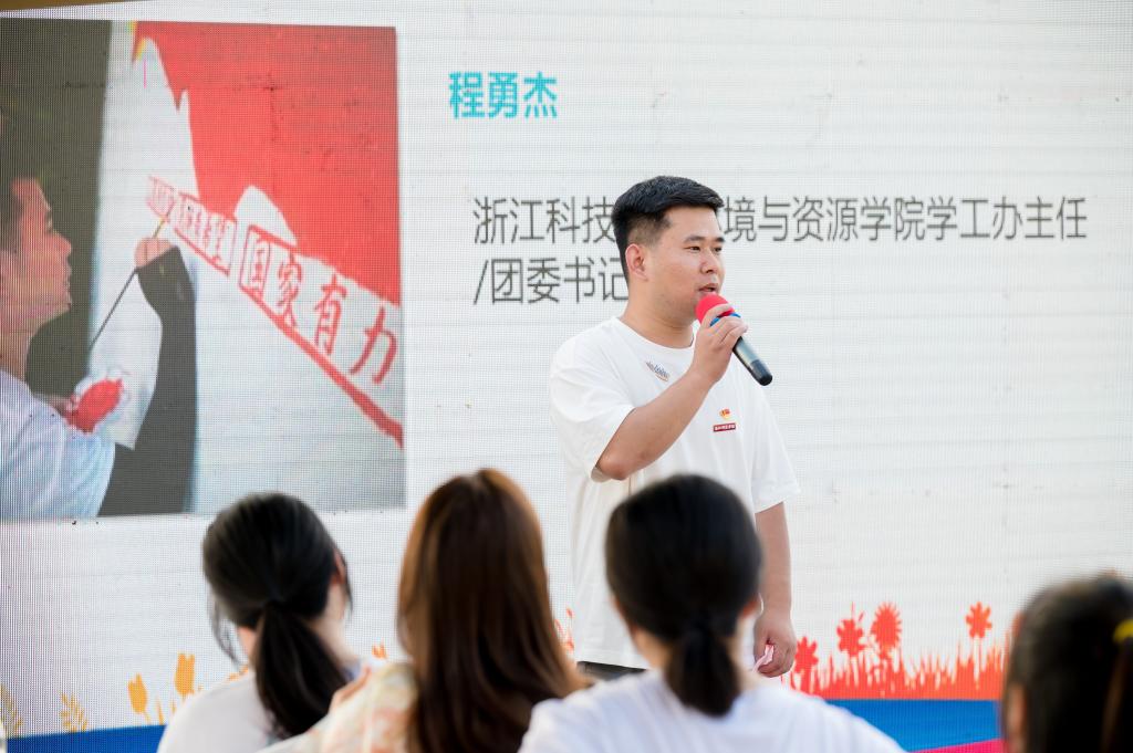 程勇杰代表实践指导教师发言,从浙江科技学院教师和淳安人双重身份作为切入点,介绍了浙江科技学院的办学历程、发展现状和“十四五”时期的发展战略,同时希望从人才培养、科技创新等方面,发挥好校地合作的枢纽作用,主动融入淳安的经济建设和社会发展。漫画人