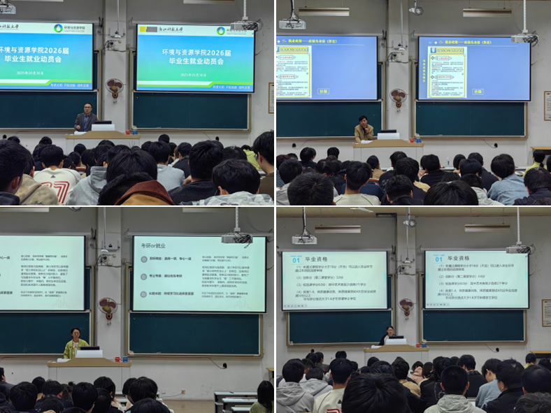 2026届毕业生就业工作提出明确要求,并希望毕业生树立正确的就业观和择业观。随后,招生就业办公室俞广良老师围绕就业核心议题,系统解读了当前就业形势,引导学生重塑就业观念、提升求职技能。他重点强调了毕业生应准确进行自我定位、树立科学择业观,并呼吁大家积极应对就业挑战,避免“慢就业”现象,切实把握9月至11月的就业关键窗口期。研究生招生办李立园老师针对升学需求,开展2026年考研专项指导,详细指导考研政策细节解读、适配院校筛选及目标院校招生指南研读方法。研究生秘书梁茹婷老师为毕业生详细解读了学位申请事宜,明确了研究生硕士学位与本科生学士学位的申请流程。