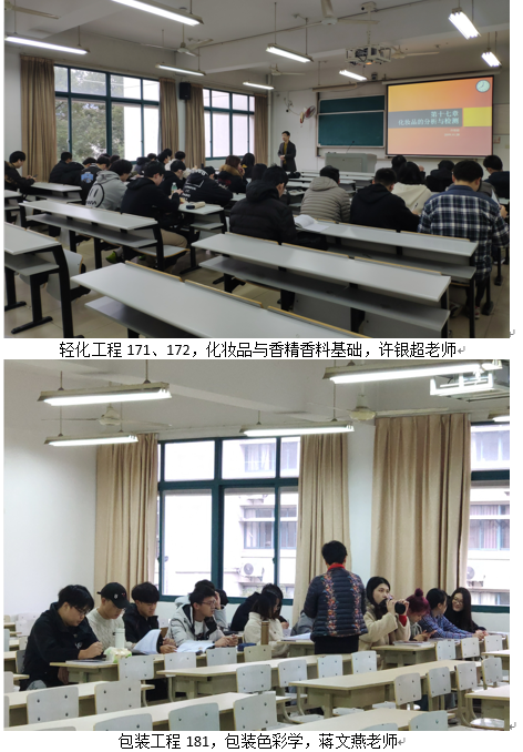 轻化工程171、172,化妆品与香精香料基础,许银超老师,应到39人,7:50分到教室4人,7:59分到教室19人,8:00到教室27人,教师备课充分,课堂氛围较好。