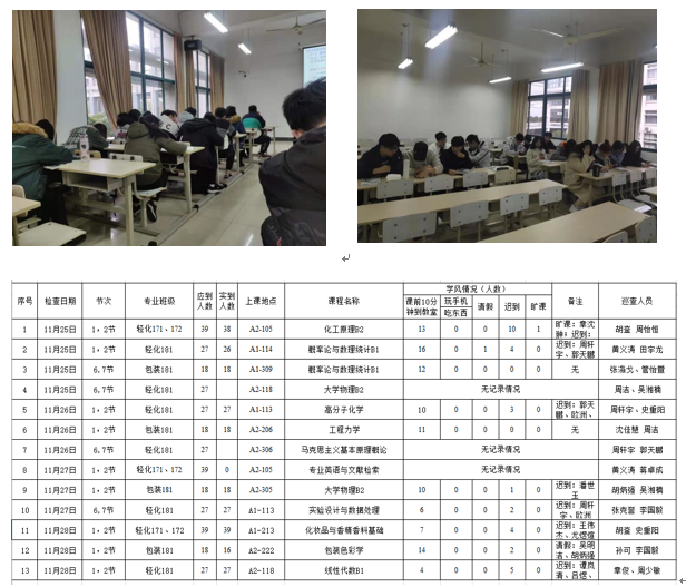 在本周的学风检查中,没有出现吃早餐和玩手机的现象。但是提前十分钟到达教室的同学与之间相比减少了很多,而且本周迟到、旷课以及请假的同学较多。根据本周学风督查汇总表可知,这周的学风情况很差。临近考试,希望学委能够督促大家不要松懈,晚上早点休息,以免第二天上课迟到。