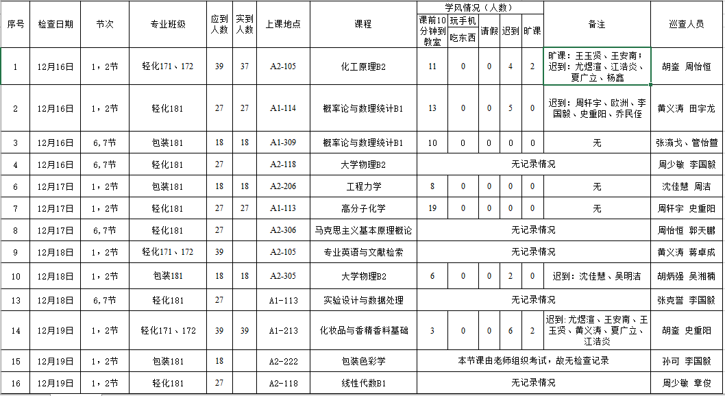 周一:《概率论与数理统计》课程,吴阿林老师,老师提前15分钟到教室,所授理论内容和实际较为贴合,轻化18级同学的就坐较为集中,听课氛围整体良好,少数同学存在不专心现象。《化工原理》课程,刘宝鉴老师,老师提前15分钟到教室,所授理论内容和实际较为贴合,轻化17级同学的就坐较为集中,听课氛围好,少数同学存在分神现象。