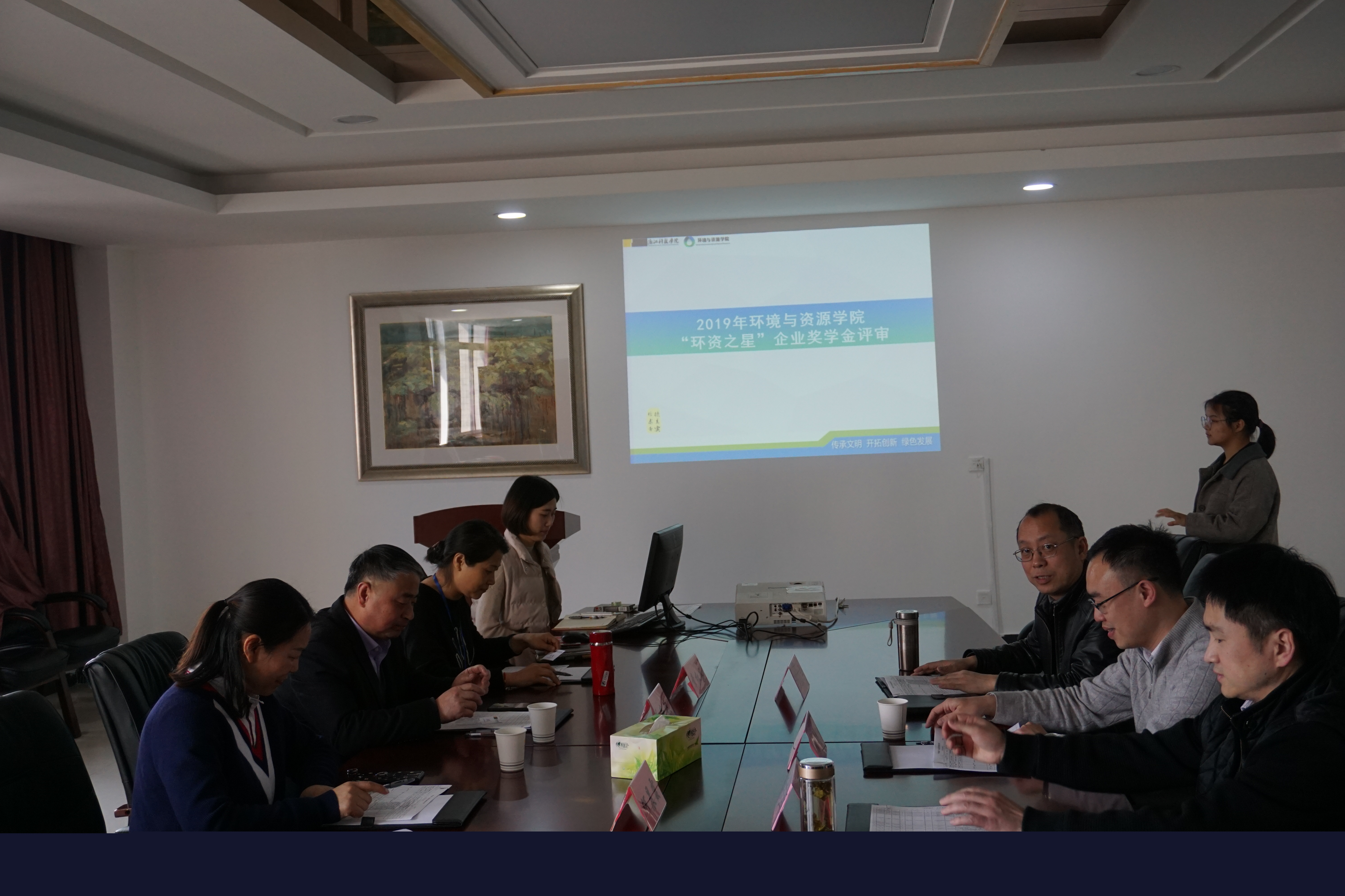 “环资之星”企业奖学金评审会正式展开。杭州特种纸有限公司吴安波副总经理、浙江景兴纸业股份有限公司章红英经理、杭州华旺新材料科技股份有限公司何晨霞主任、浙江科技学院团委书记李俊与漫画人
