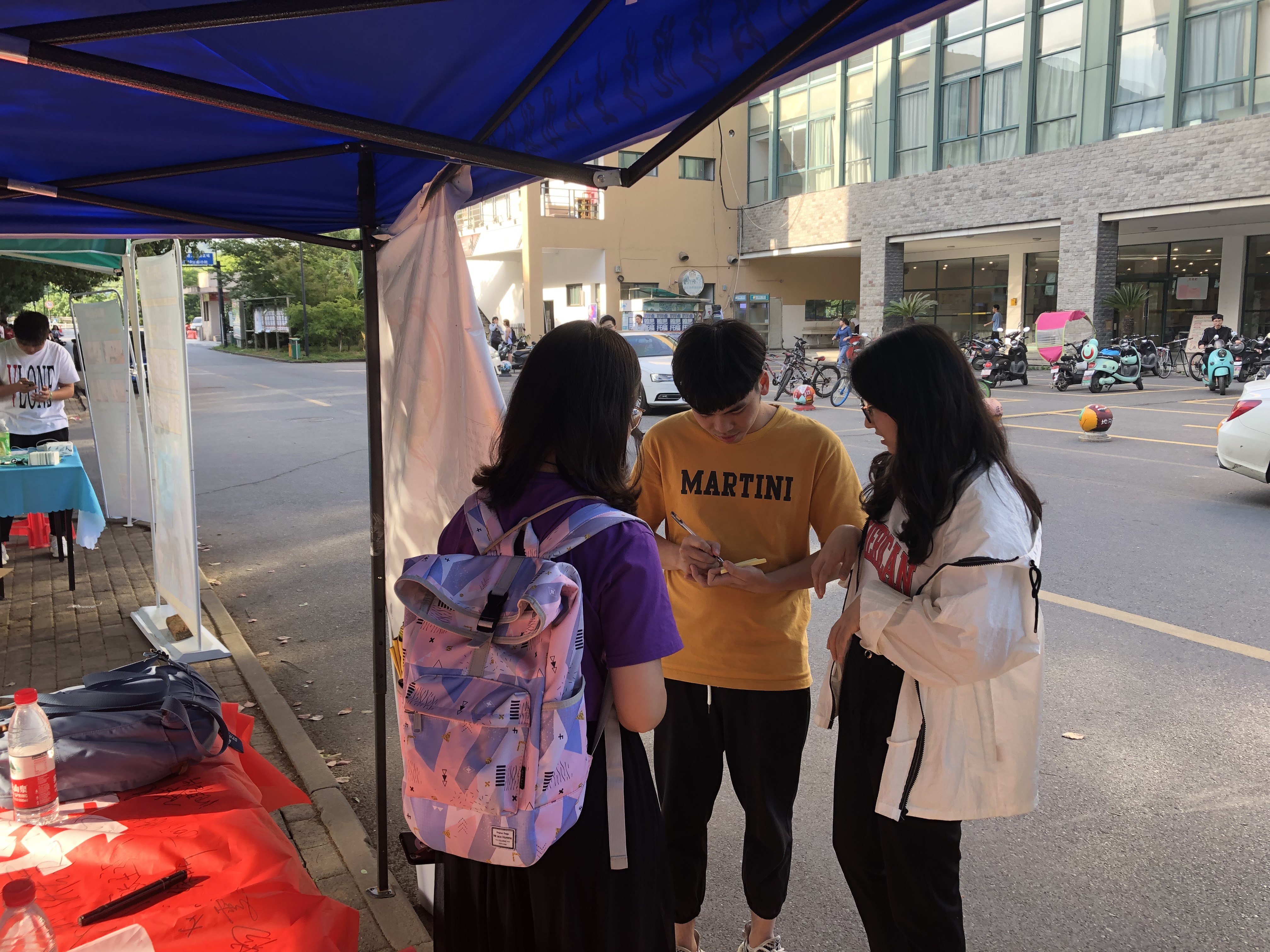 上午11点开始,红色的横幅和秀丽清新的“建议板”形成了视觉上强烈的对比,路过的老师、同学们等纷纷驻足,在横幅上签下自己的名字,并将环保方面提出的建议写于便笺上,粘贴在建议板上。不一会儿,横幅和建议板上已是满满当当。同时,桌上的糖果也将521的甜蜜反馈给了参与者。
